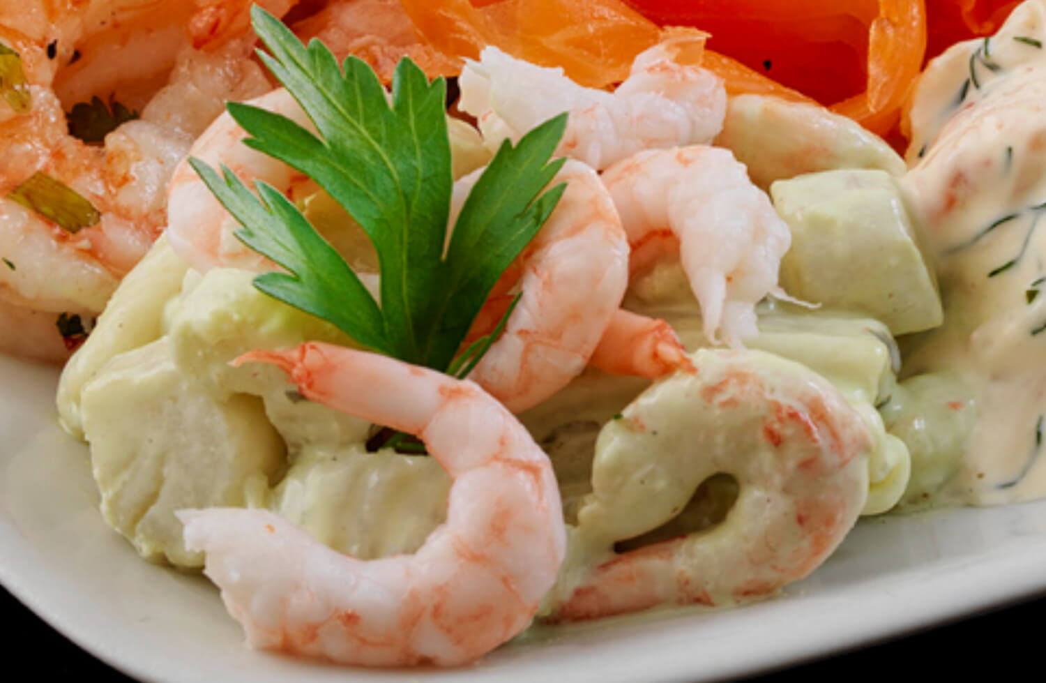 Pastasalat fra vårt kjøkken med håndpillede reker og dampede kamskjell i kremet estragondressing.