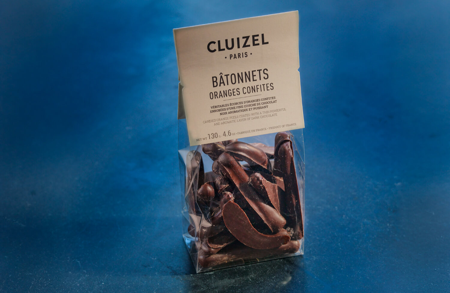 Kandiserte appelsinstenger trukket med 63% mørk sjokolade fra Cluizel, Paris.