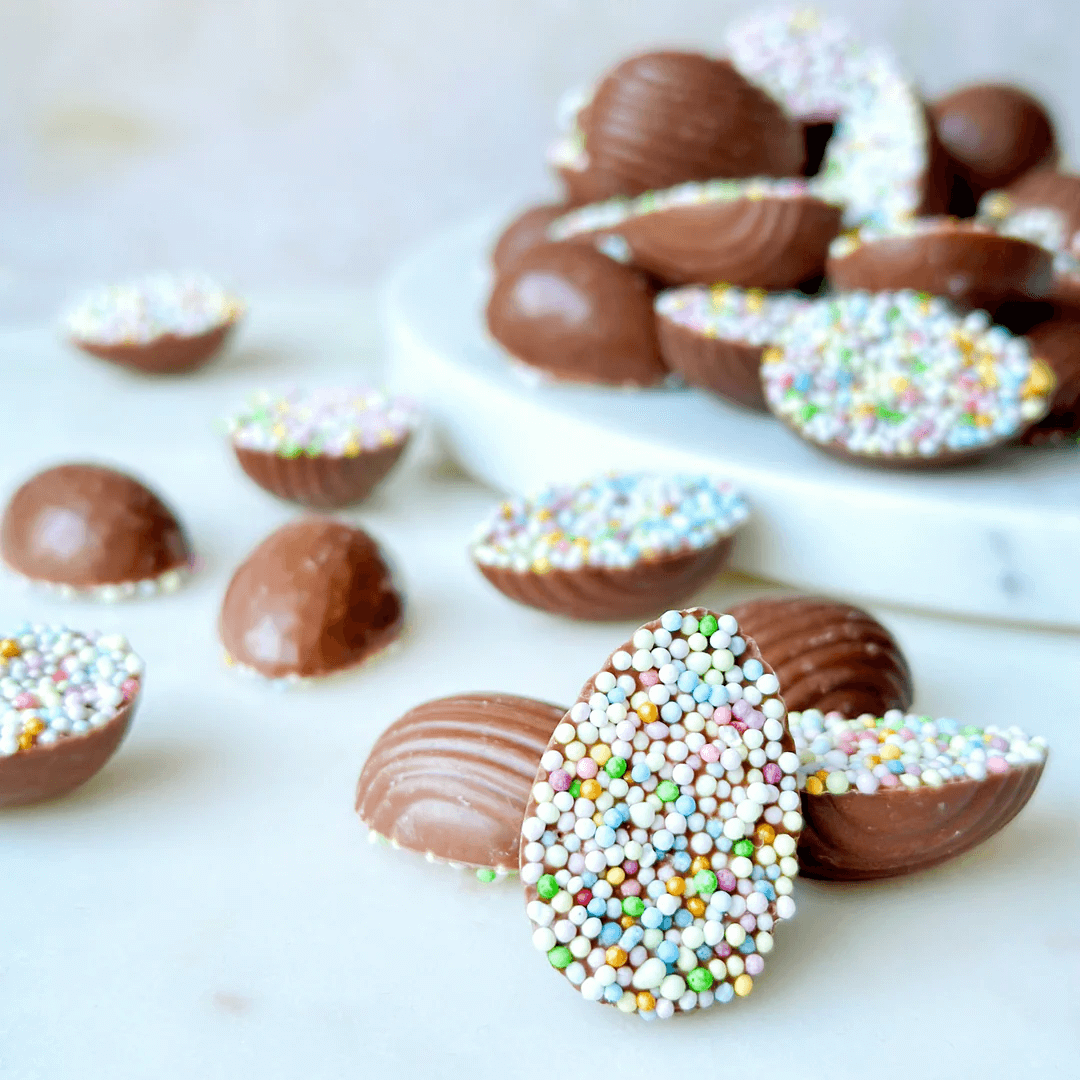 Søte, håndlagde sjokoladeegg dyppet i knasende miniperler i påskens pastellfarger fra Smelt
